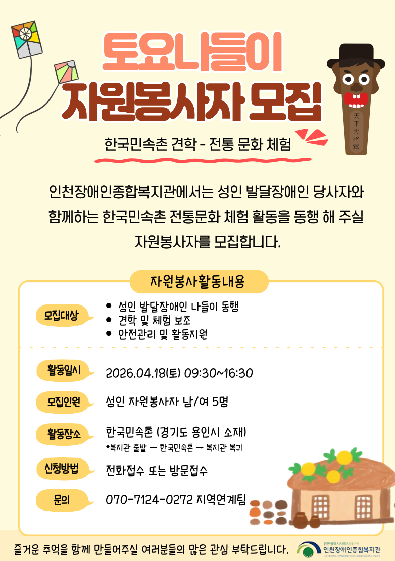 인천장애인종합복지관에서는 성인 발달장애인 당사자와 함께하는 「한국민속촌 전통문화 체험 활동」에 참여할 자원봉사자를 모집하고 있습니다.