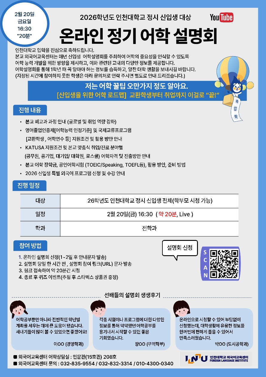 2026학년도 인천대학교 정시 신입생 대상 온라인 정기 어학 설명회 안내