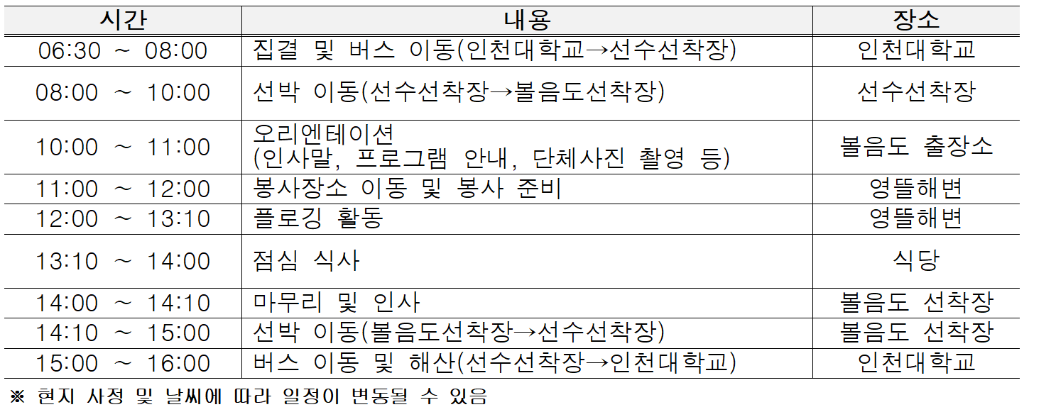※ 당일 06:30까지 인천대학교 학생회관 앞 버스정류장 집결 후 단체 이동 예정