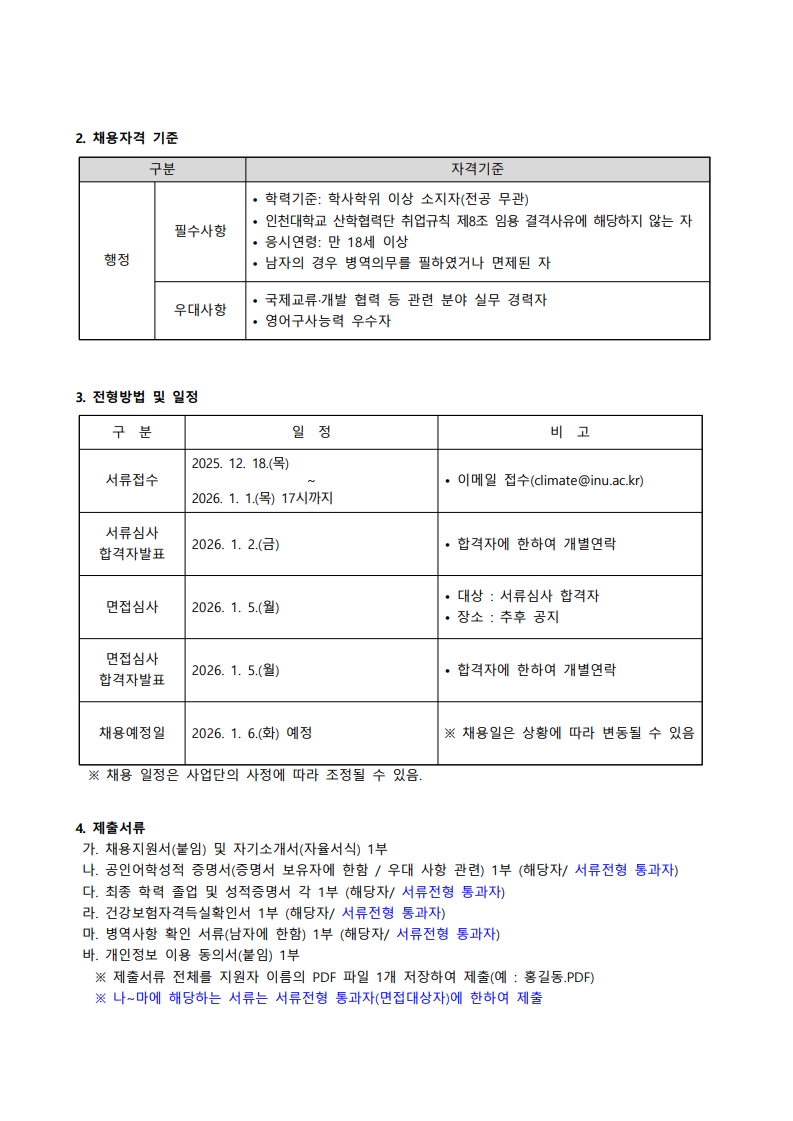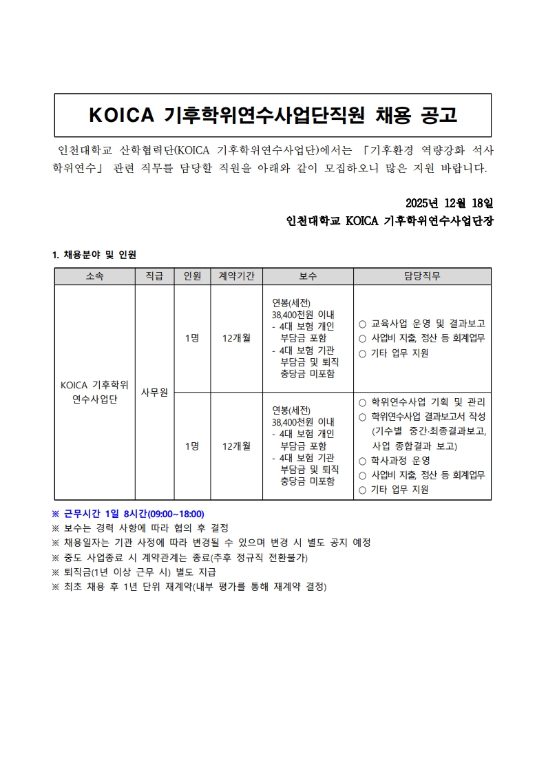 fnctId=bbs,fnctNo=2611 분류 [모집] 인천대학교 KOICA 기후학위연수사업단 직원 채용 공고(~2026.01.01. 17:00까지) 글번호 416629 작성일 2025-12-18 수정일 2025-12-18 작성자 산학협력단 (032-835-9695) 조회수 134 첨부파일 직원채용공고_KOICA.pdf 채용지원서(양식)_KOICA.hwp 목록